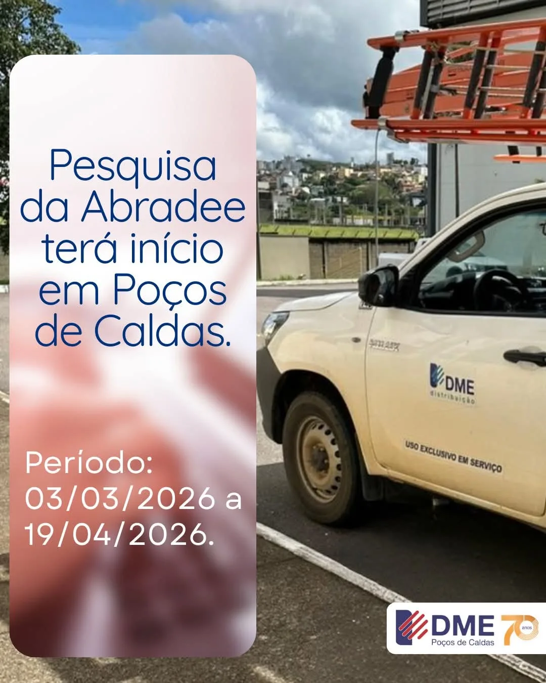 A Associação Brasileira de Distribuidores de Energia Elétrica (Abradee) inicia na terça-feira, 3 de março, a etapa de entrevistas da Pesquisa de Satisfação do Consumidor Residencial em Poços de Caldas. A aplicação dos questionários seguirá até o dia 19 de abril, conforme cronograma divulgado pela entidade.