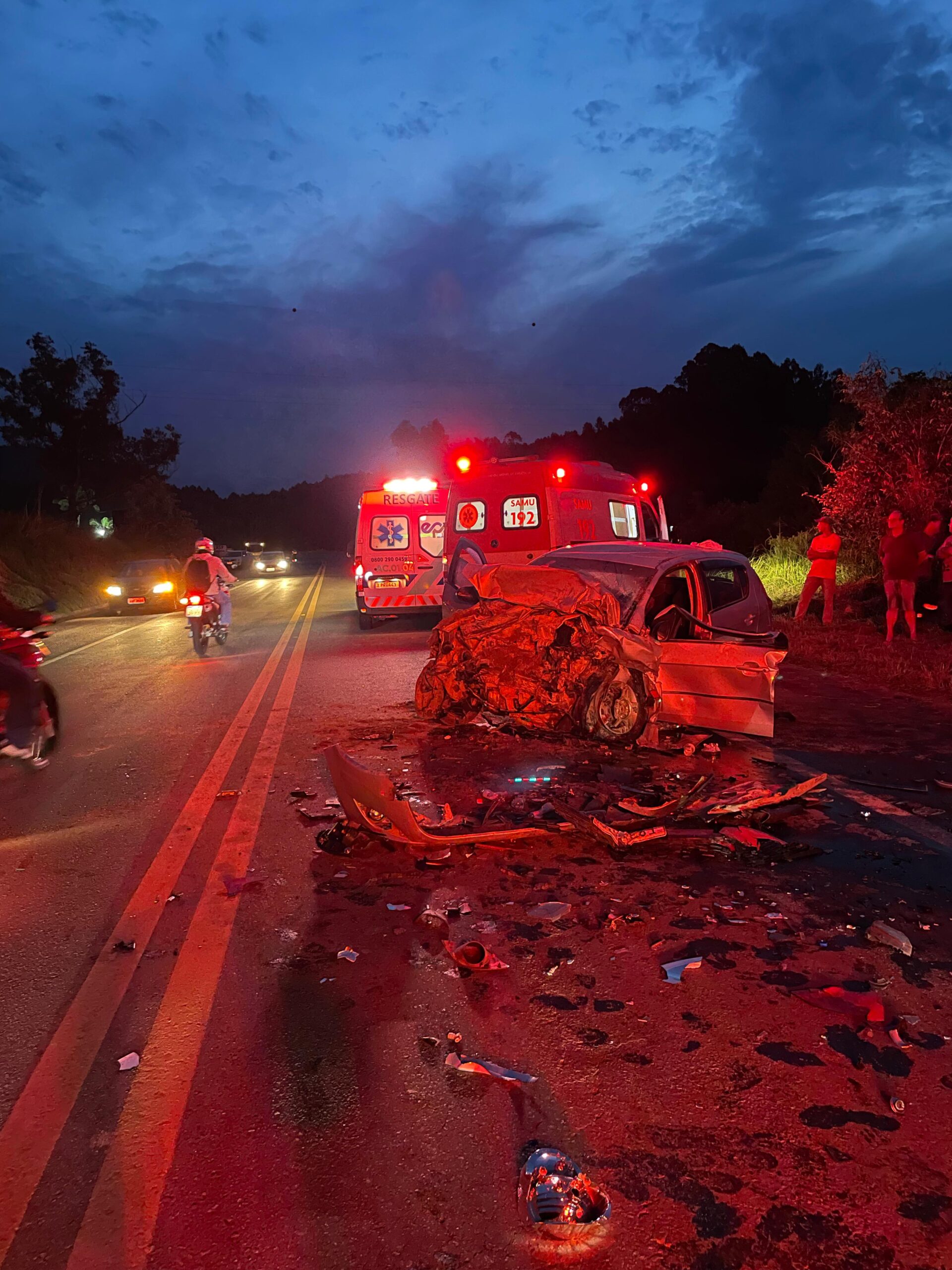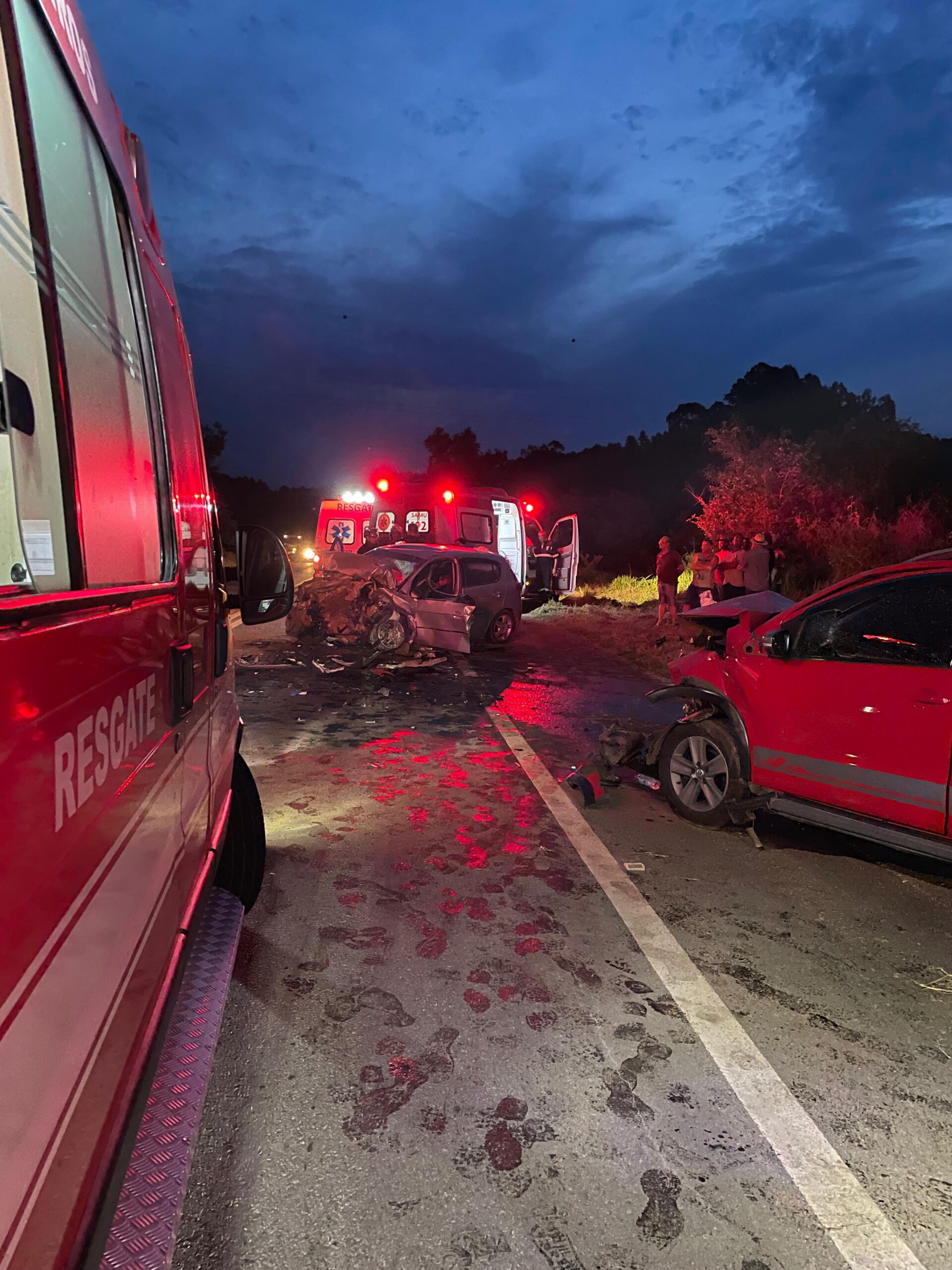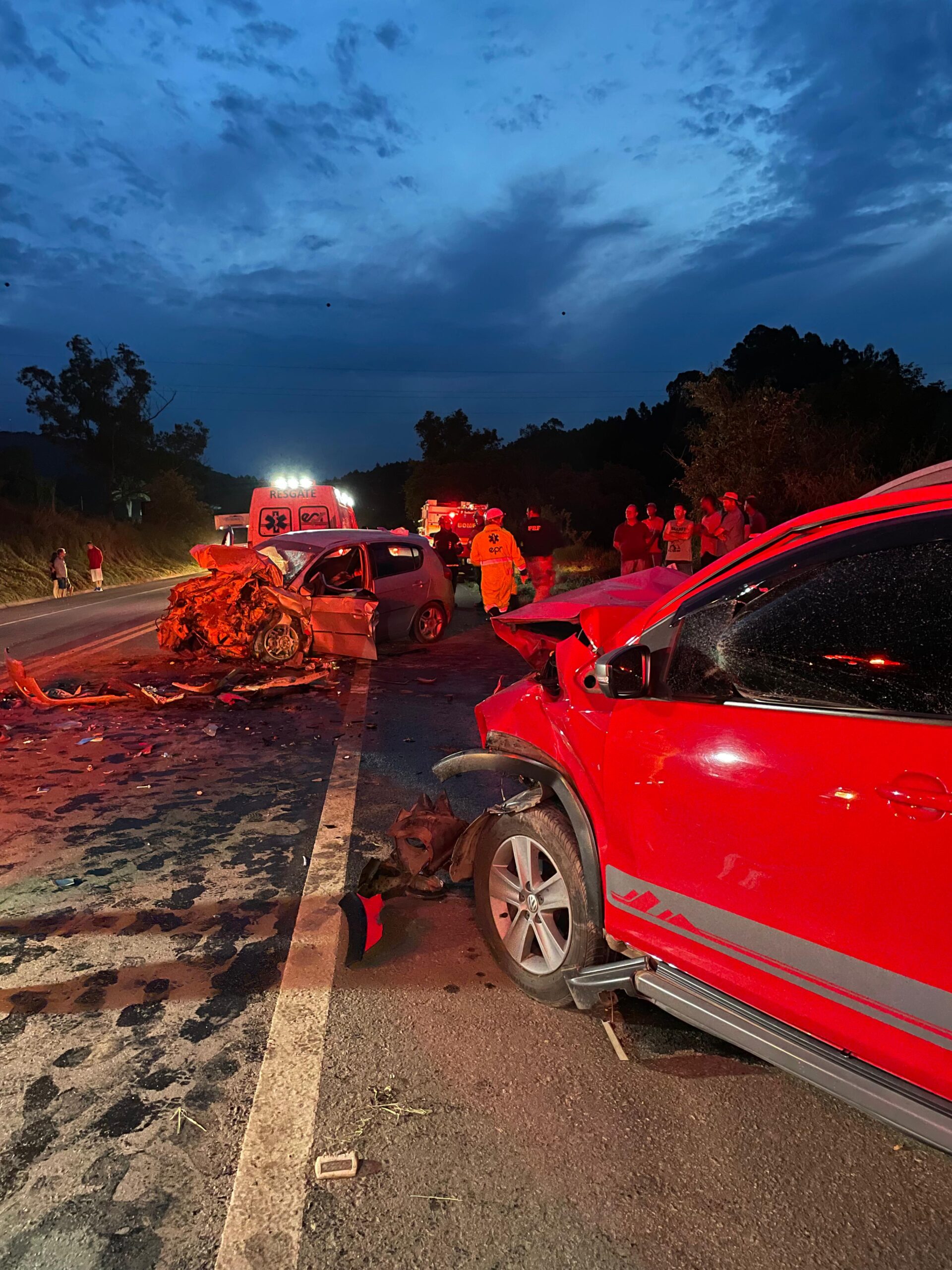Após avaliar a cena, os bombeiros estabilizaram os veículos e auxiliaram no atendimento das vítimas. O acidente envolveu dois veículos: um Fox vermelho com duas ocupantes e um Pálio prateado com três ocupantes.