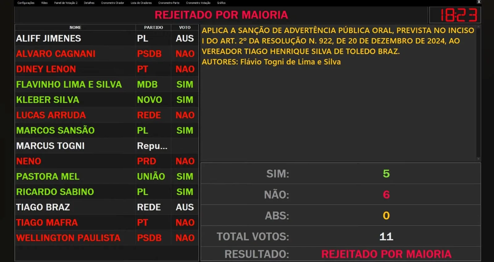 Votaram CONTRA a advertência os vereadores Álvaro Cagnani (PSDB), Diney Lenon (PT), Lucas Arruda (Rede), Neno (PRD), Tiago Mafra (PT) e Wellington Paulista (PSDB).