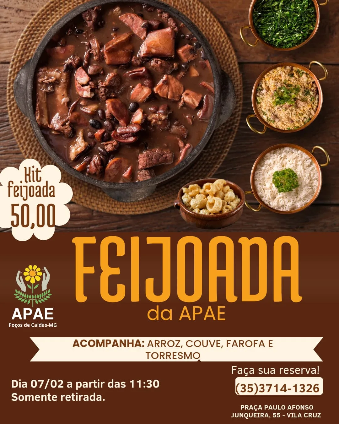 Toda a renda arrecadada com a feijoada será destinada às atividades da APAE de Poços de Caldas, que atua no atendimento e no desenvolvimento de pessoas com deficiência intelectual e múltipla, promovendo inclusão, educação e qualidade de vida.