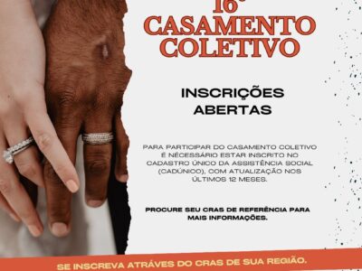 SEGUEM ABERTAS, ATÉ DIA 11/09, AS INSCRIÇÕES PARA O CASAMENTO COLETIVO 2023
