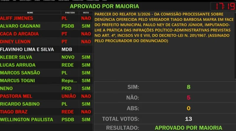 A decisão encerra o processo que poderia resultar na cassação do chefe do Executivo municipal. O plenário acompanhou o parecer da Comissão Processante, que apontou ausência de justa causa para o prosseguimento da denúncia.