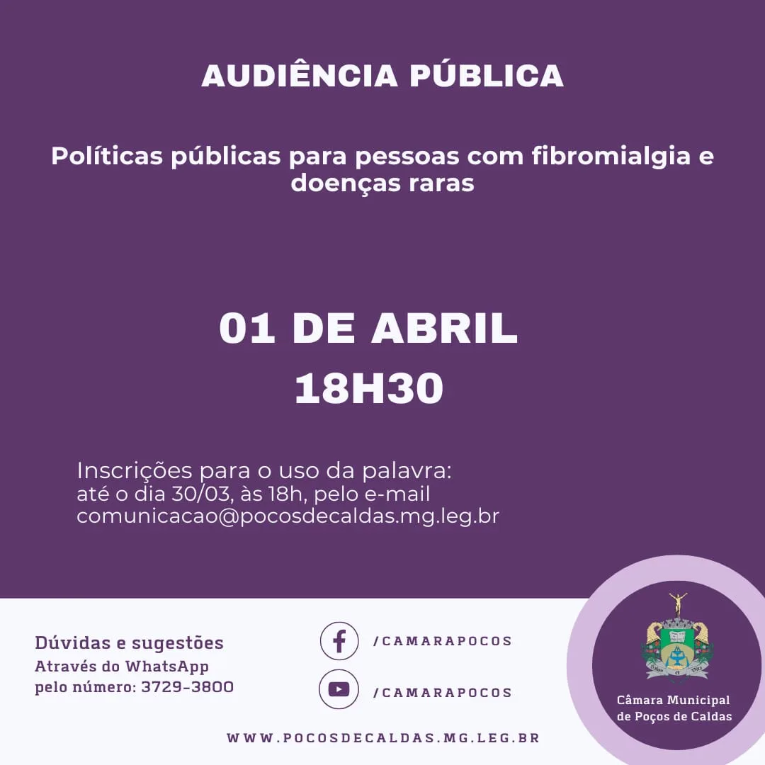 A Câmara Municipal de Poços de Caldas realiza, no dia 1º de abril de 2026, quarta-feira, às 18h30, a 8ª audiência pública do exercício, com o tema “Políticas públicas para pessoas com fibromialgia e doenças raras”. O encontro é aberto à participação da comunidade e acontecerá com formato presencial e transmissão online.