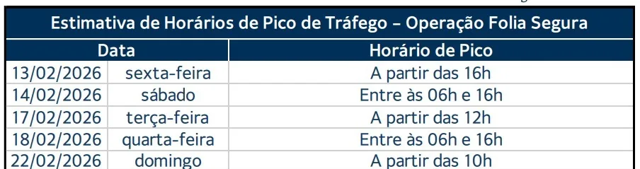 A concessionária também divulgou a estimativa de horários de maior movimento nas rodovias durante a Operação Folia Segura. Confira: