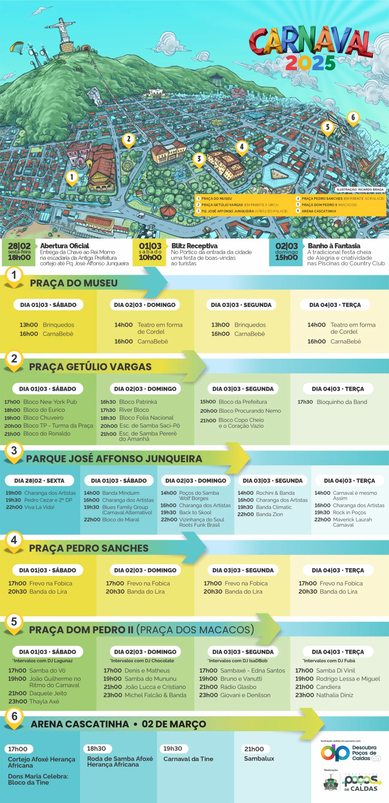O Carnaval de Poços de Caldas promete ser um dos mais animados dos últimos anos, com uma programação diversificada que inclui 13 blocos de rua, mais de 40 shows e atrações espalhadas por sete pontos principais da cidade. Segundo os organizadores, a expectativa é de um aumento de 10% no público em relação ao ano passado, consolidando o evento como um dos principais do Sul de Minas.