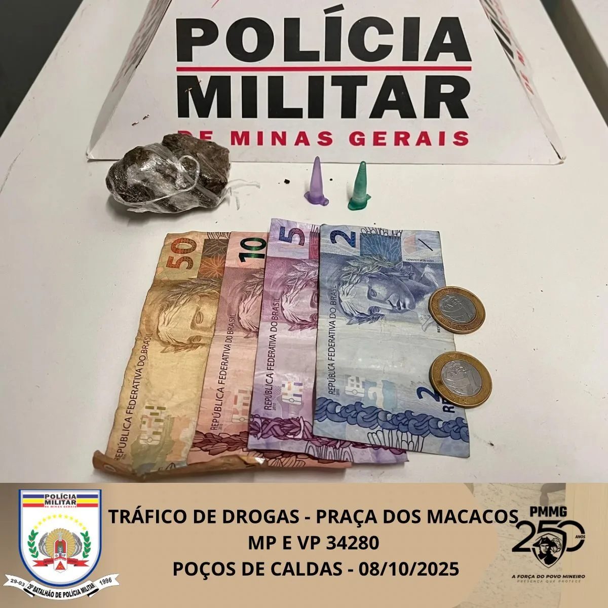 A Polícia Militar prendeu um casal suspeito de envolvimento com o tráfico de drogas na tarde de quarta-feira (8), na Praça Dom Pedro II, conhecida como Praça dos Macacos, no Centro de Poços de Caldas.
