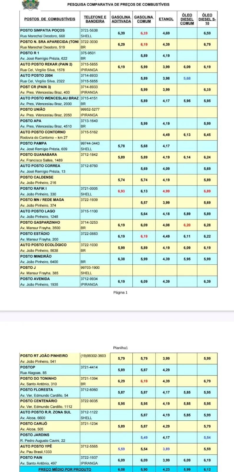 Abaixo, segue a tabela integral com os preços praticados nos 33 postos de combustível do município, conforme levantamento do Procon: