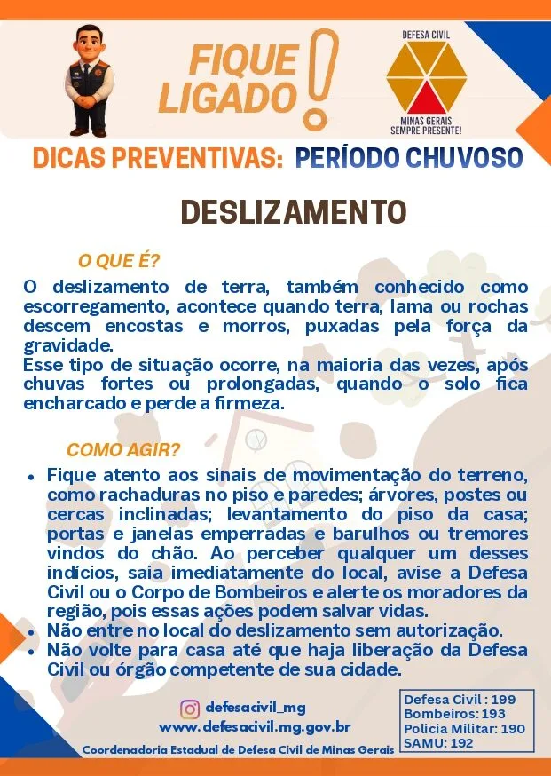 Em situações de emergência, os atendimentos podem ser acionados pelos telefones 199 (Defesa Civil), 193 (Corpo de Bombeiros), 190 (Polícia Militar) e 192 (SAMU). Mais orientações preventivas estão disponíveis no site oficial da Defesa Civil de Minas Gerais e nas redes sociais do órgão.