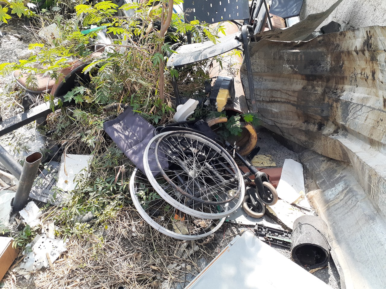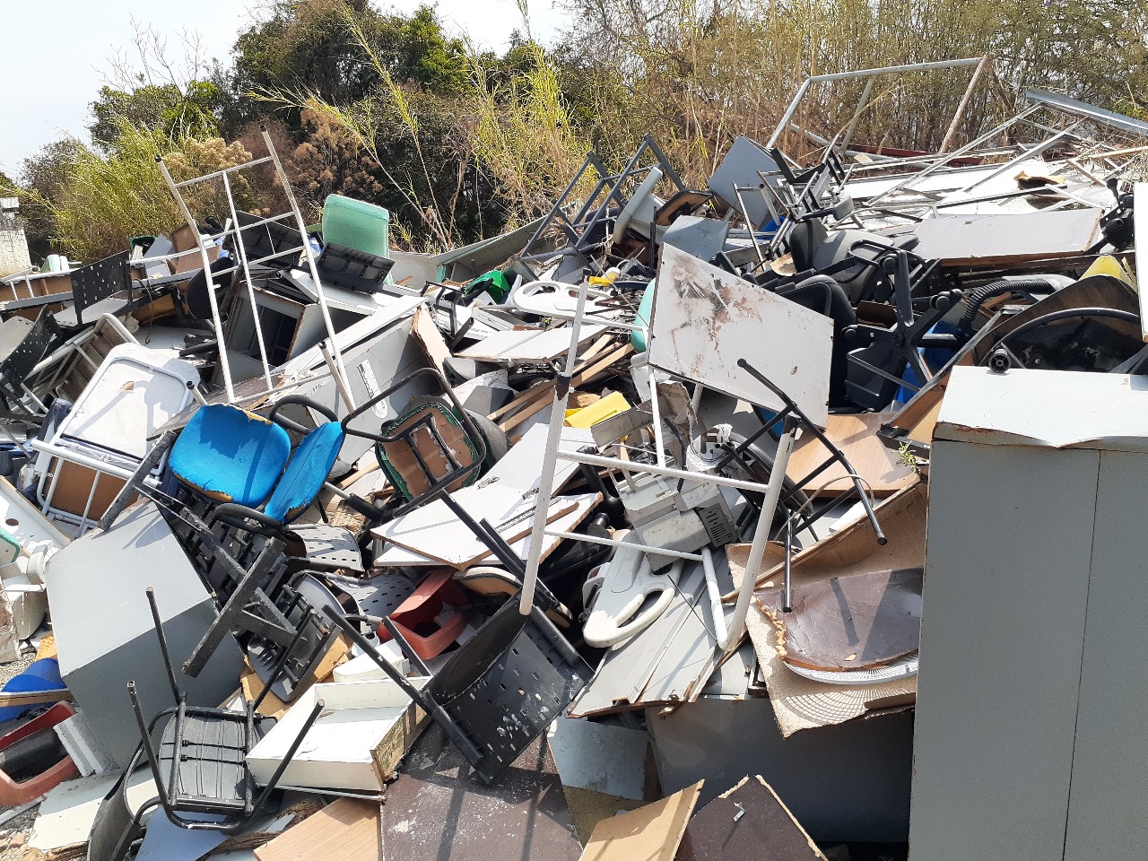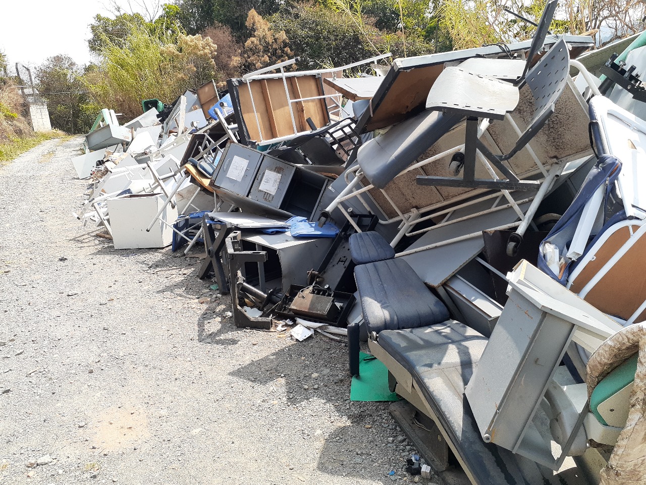 De acordo com as imagens enviadas pelo denunciante, foram encontrados filtros de máquinas de asfaltamento e materiais hospitalares sucateados, levantando preocupações sobre possíveis danos ambientais.