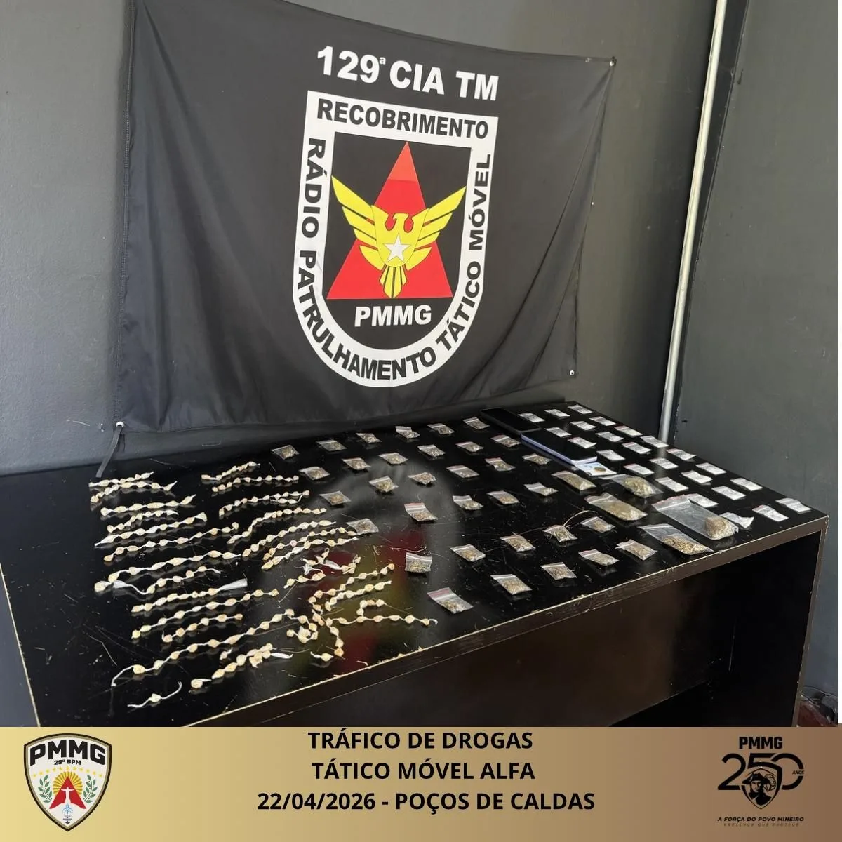 Uma denúncia anônima recebida pelo 190 resultou na prisão de dois suspeitos por tráfico de drogas na região da Rua Fosco Pardini, em Poços de Caldas.