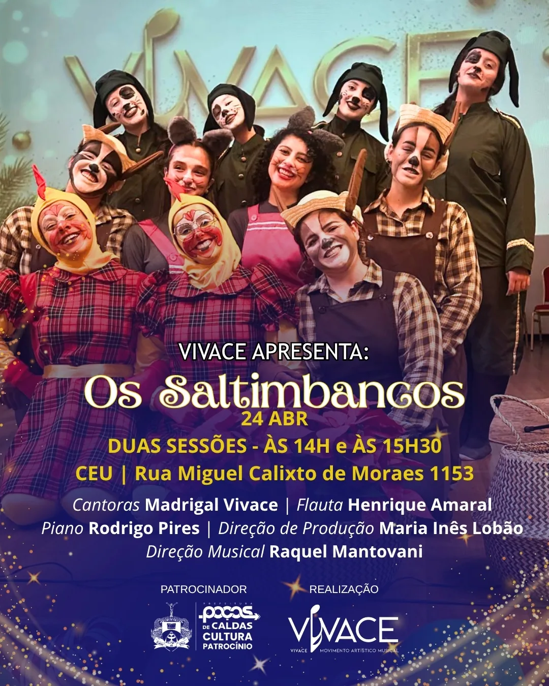A alegria do teatro musical infantil vai tomar conta do Centro de Artes e Esportes Unificado (CEU) da zona leste de Poços de Caldas nesta sexta-feira (24). O espetáculo “Os Saltimbancos” será apresentado em duas sessões gratuitas, às 14h e às 15h30, com entrada aberta à comunidade.