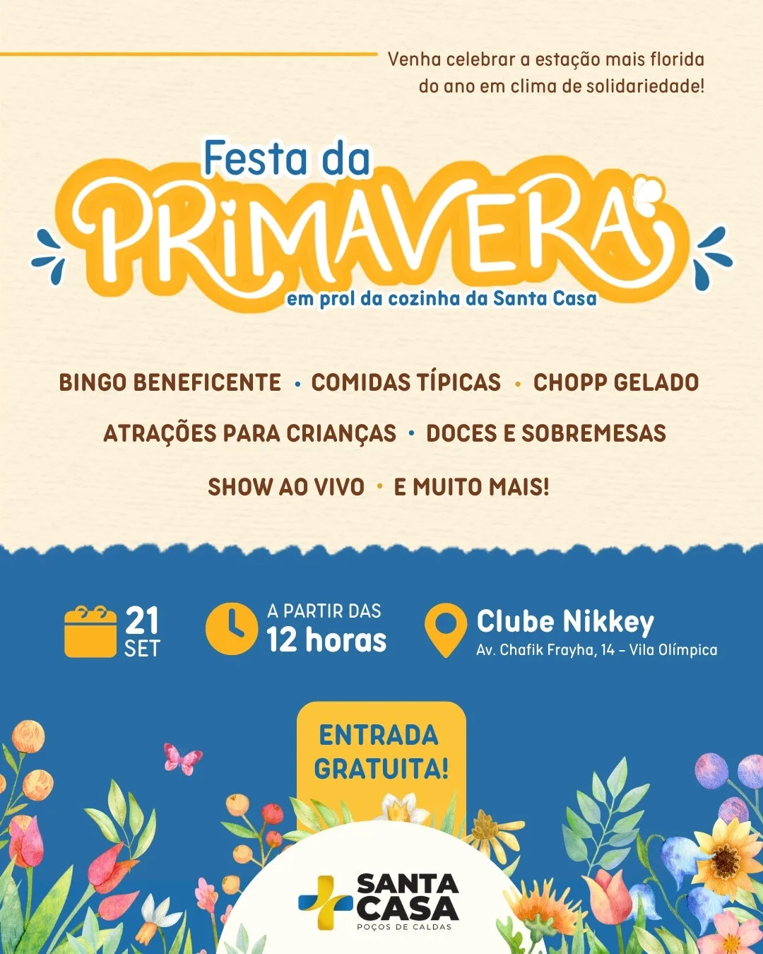 A Santa Casa de Poços de Caldas e a Associação Voluntários Amigos da Santa Casa (SOS Santa Casa) promovem neste domingo (21) a Festa da Primavera, um evento beneficente em prol do Serviço de Nutrição e Dietética do hospital. A celebração acontece a partir das 12h, no Clube Nikkey (Av. Chafik Frayha, 14 – Vila Olímpica), atrás do estádio Ronaldão, com entrada gratuita.