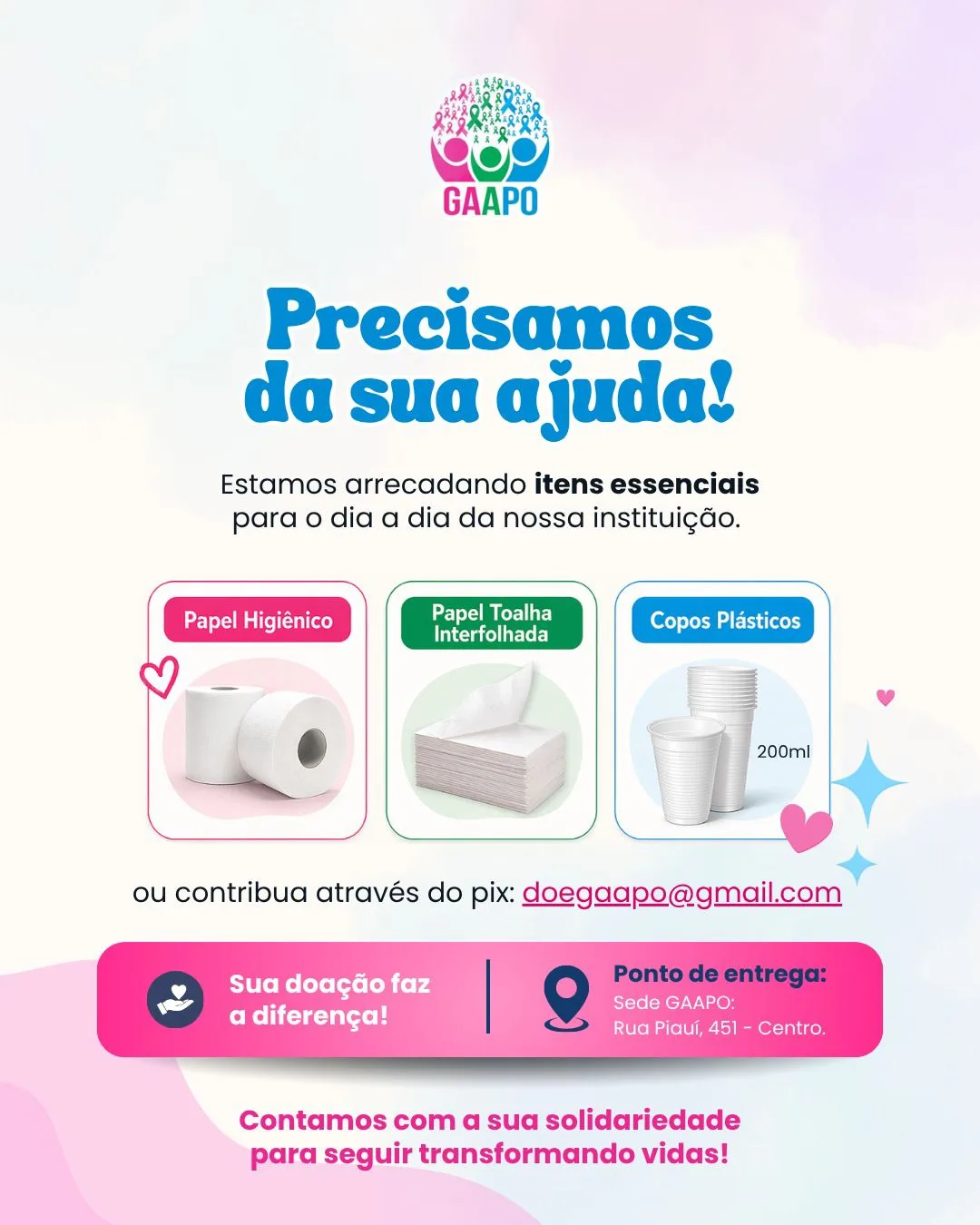 De acordo com o comunicado divulgado pela entidade, há necessidade urgente de produtos como papel higiênico, papel toalha interfolhado e copos plásticos de 200 ml. As doações podem ser entregues diretamente na sede da instituição, localizada na Rua Piauí, 451, no Centro, ou feitas por meio de contribuição via PIX, pelo e-mail doegaapo@gmail.com.