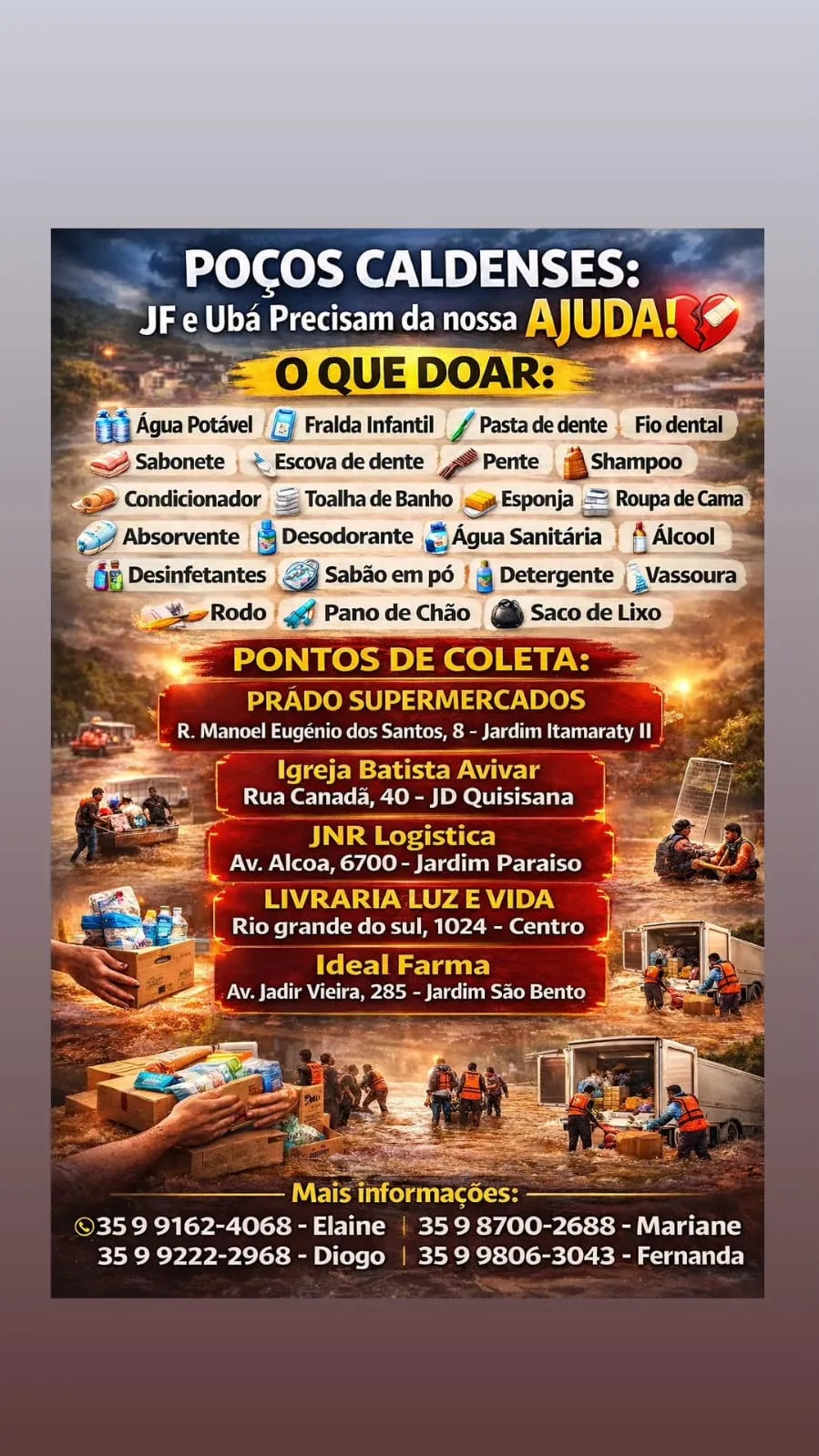 “Juiz de Fora e Ubá têm sofrido muito com essa tragédia. Muitas famílias perderam filhos, pais, e vivem um momento de grande tristeza. Aqui em Poços queremos fazer a nossa parte, levar apoio e conforto. Já temos transporte garantido pela JNR Logística e, se tudo correr bem, ainda esta semana um caminhão deve sair com as doações”, afirmou.