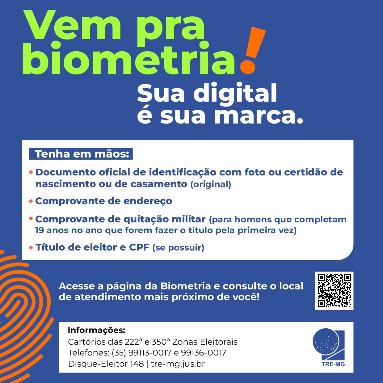 Além do Disque-Eleitor, os telefones para contato com a Justiça Eleitoral local são (35) 9 9113-0017 e (35) 9 9136-0017. Mais detalhes sobre a biometria e os locais de atendimento podem ser consultados no site oficial do Tribunal Regional Eleitoral de Minas Gerais (TRE-MG): https://www.tre-mg.jus.br/servicos-eleitorais/biometria-1.