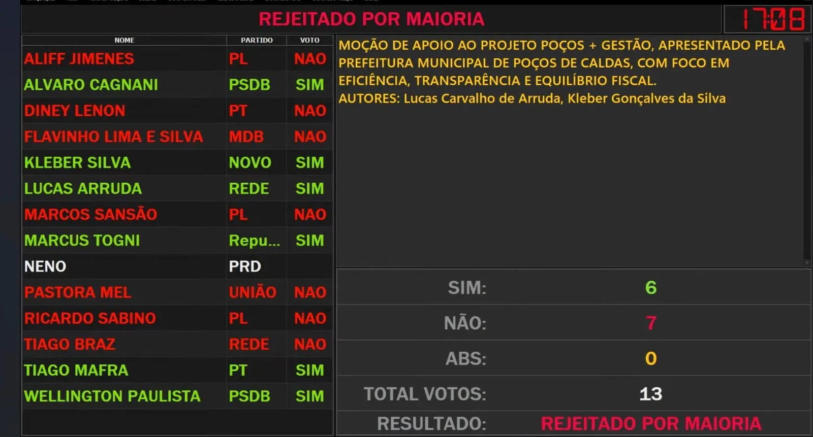 A Câmara Municipal de Poços de Caldas rejeitou, por 7 votos a 6, uma moção de apoio ao projeto “Poços + Gestão”, iniciativa do Executivo voltada à eficiência administrativa, transparência e equilíbrio fiscal na sessão ordinária de ontem (14/10). A proposta, apresentada pelos vereadores Kleber Silva (Novo) e Lucas Arruda (Rede), buscava demonstrar alinhamento institucional do Legislativo com as diretrizes do plano lançado pela Prefeitura na última sexta-feira (10).