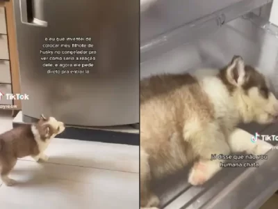 Filhote de husky se refresca na geladeira no calor do Nordeste e vídeo bate 12M