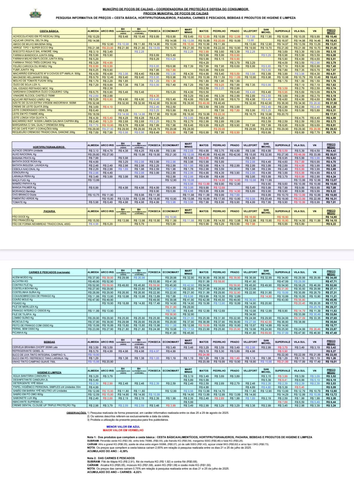 Ao todo, foram pesquisados produtos em 15 supermercados a atacarejos de Poços.