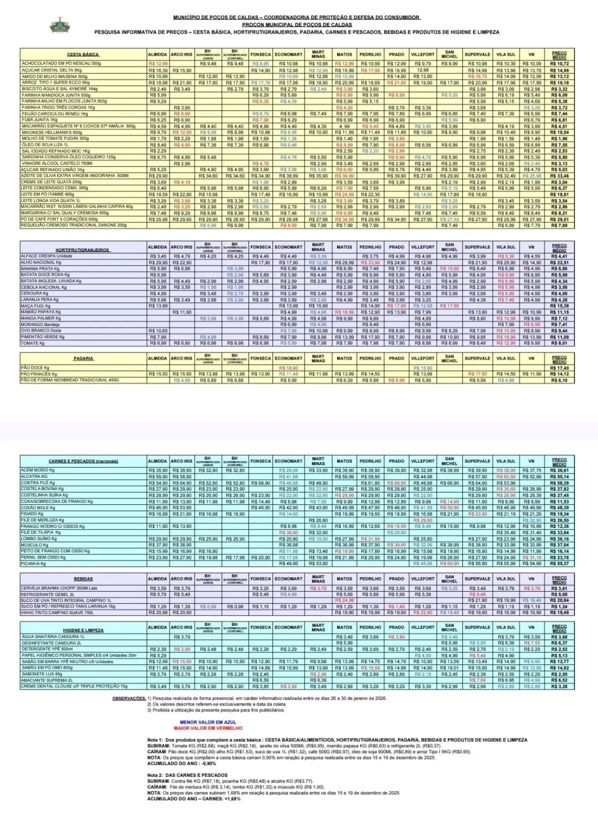 O Procon de Poços de Caldas divulgou uma nova pesquisa de preços da cesta básica, que aponta queda de 0,90% em relação ao levantamento anterior. O estudo considerou apenas dados oficiais e foi realizado presencialmente em supermercados e atacarejos do município entre os dias 26 e 30 de janeiro.