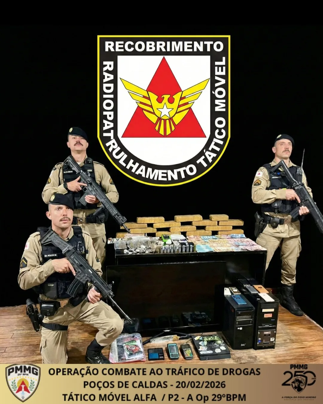 Na ação, os militares apreenderam 16 quilos de maconha, 50 gramas de cocaína, sete porções de crack, 13 porções de haxixe e comprimidos de ecstasy. Também foram recolhidas munições de diferentes calibres, sendo 12 munições calibre 12, duas calibre 36 e uma calibre .38.