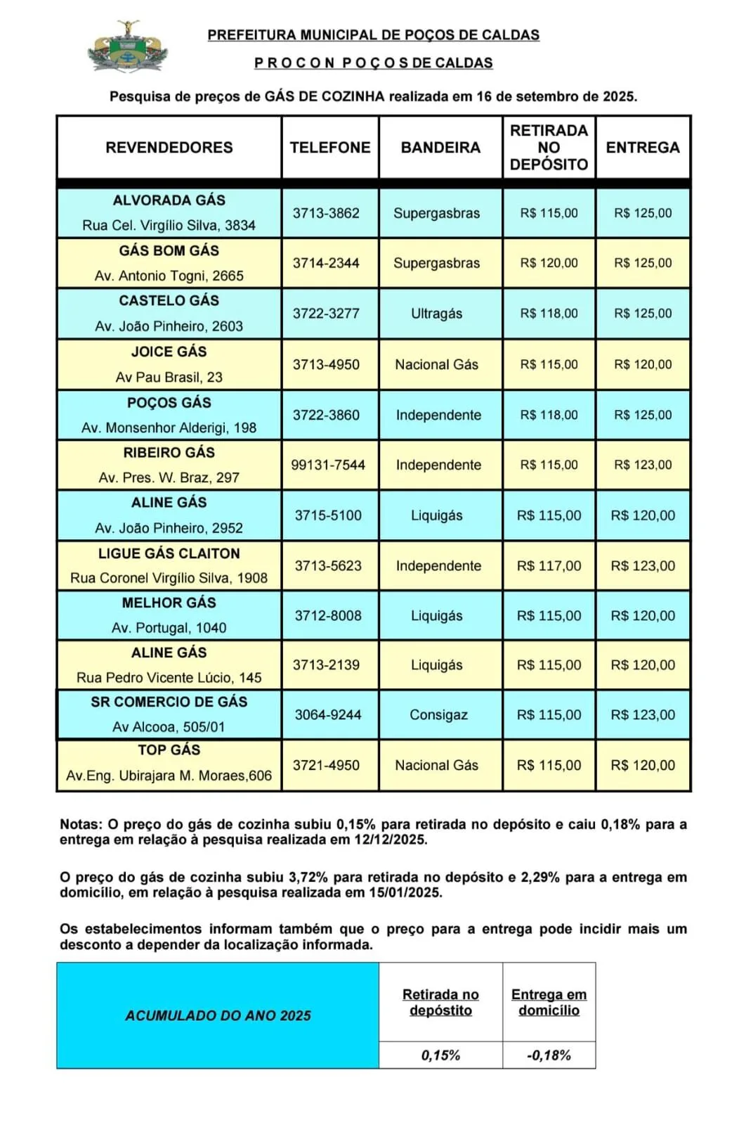 Ao todo, 12 estabelecimentos foram pesquisados em diferentes regiões de Poços de Caldas, incluindo revendas vinculadas a distribuidoras como Supergasbras, Liquigás, Ultragaz, Nacional Gás, além de pontos de venda independentes.