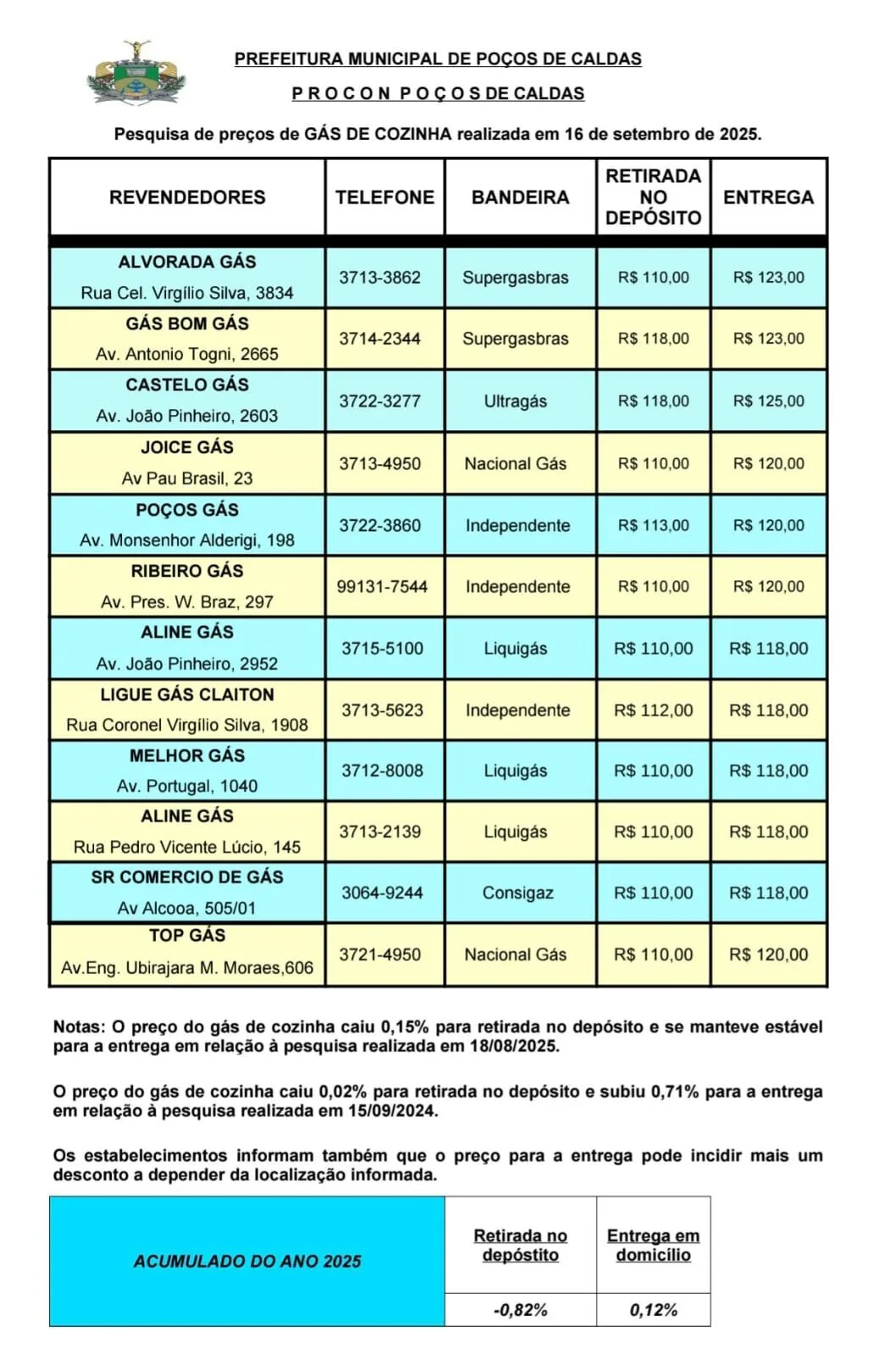 O Procon de Poços de Caldas divulgou, nesta quarta-feira (17), uma nova pesquisa de preços do botijão de gás. De acordo com o levantamento, o valor do produto apresentou queda de 0,15% para retirada no depósito em relação à pesquisa de agosto, enquanto o preço para entrega em domicílio se manteve estável.
