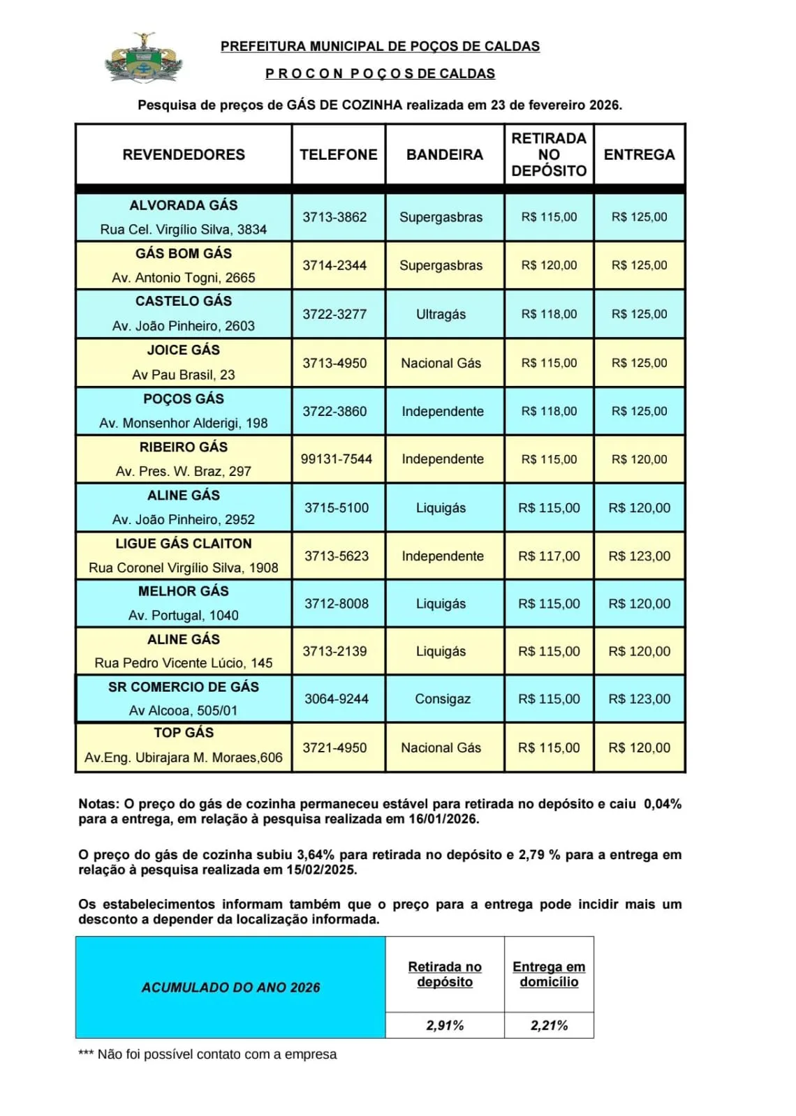 O Procon de Poços de Caldas divulgou uma nova pesquisa de preços do botijão de gás de cozinha. O levantamento foi realizado na última segunda-feira (23) em 12 estabelecimentos da cidade.