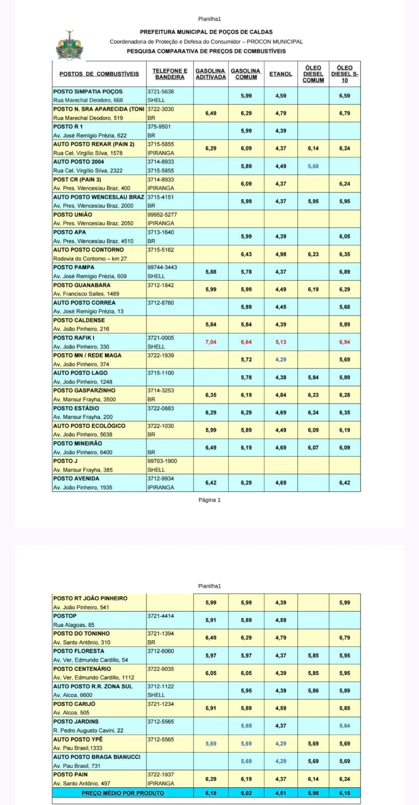 O Procon realizou uma nova pesquisa de preço dos combustíveis. Ao todo, foram consultados 34 estabelecimentos de Poços de Caldas.