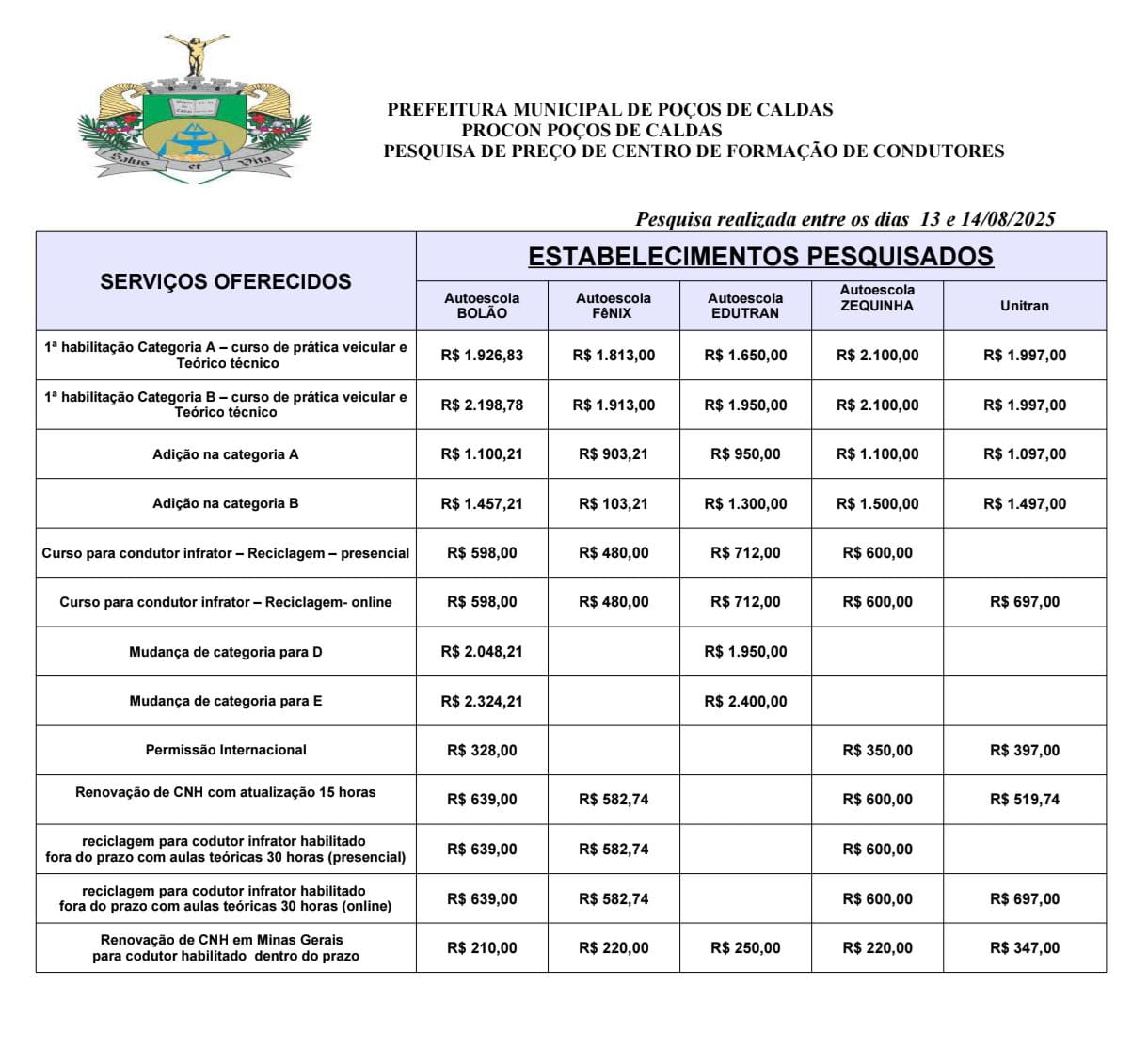 O Procon divulgou uma pesquisa de preços dos serviços das autoescolas de Poços de Caldas. Ao todo, foram consultados cinco estabelecimentos entre os dias 13 e 14 deste mês. O levantamento inclui cursos, renovação de carteira e mudança de categoria. Há variação de preço e compensa pesquisar. Acesse abaixo a lista completa.
