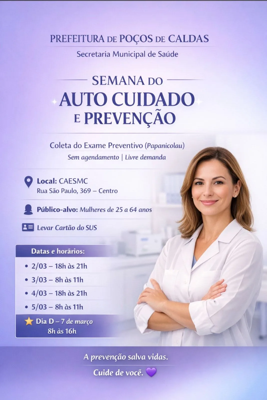 Tem início nesta segunda-feira (2) a Semana do Auto Cuidado e Prevenção dedicada às mulheres em Poços de Caldas. A iniciativa é promovida pela Secretaria Municipal de Saúde e será realizada no Centro de Atenção à Saúde da Mulher e da Criança (CAESMC), localizado na Rua São Paulo, 369, no Centro.