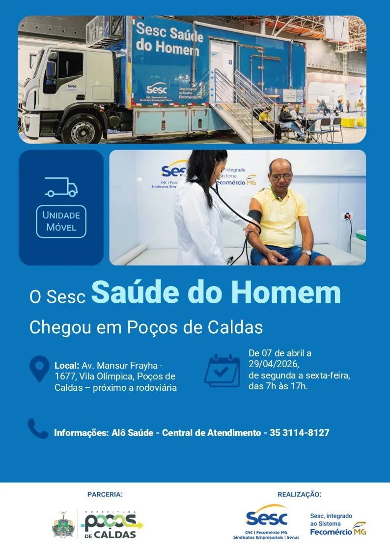 Poços de Caldas recebe, entre os dias 7 e 29 de abril de 2026, o projeto Sesc Saúde do Homem, iniciativa itinerante do Sistema Fecomércio MG, realizada por meio do Sesc em Minas. A ação oferece aproximadamente 336 consultas gratuitas e tem como objetivo ampliar o acesso da população masculina aos serviços de saúde, com foco na prevenção e no cuidado contínuo.