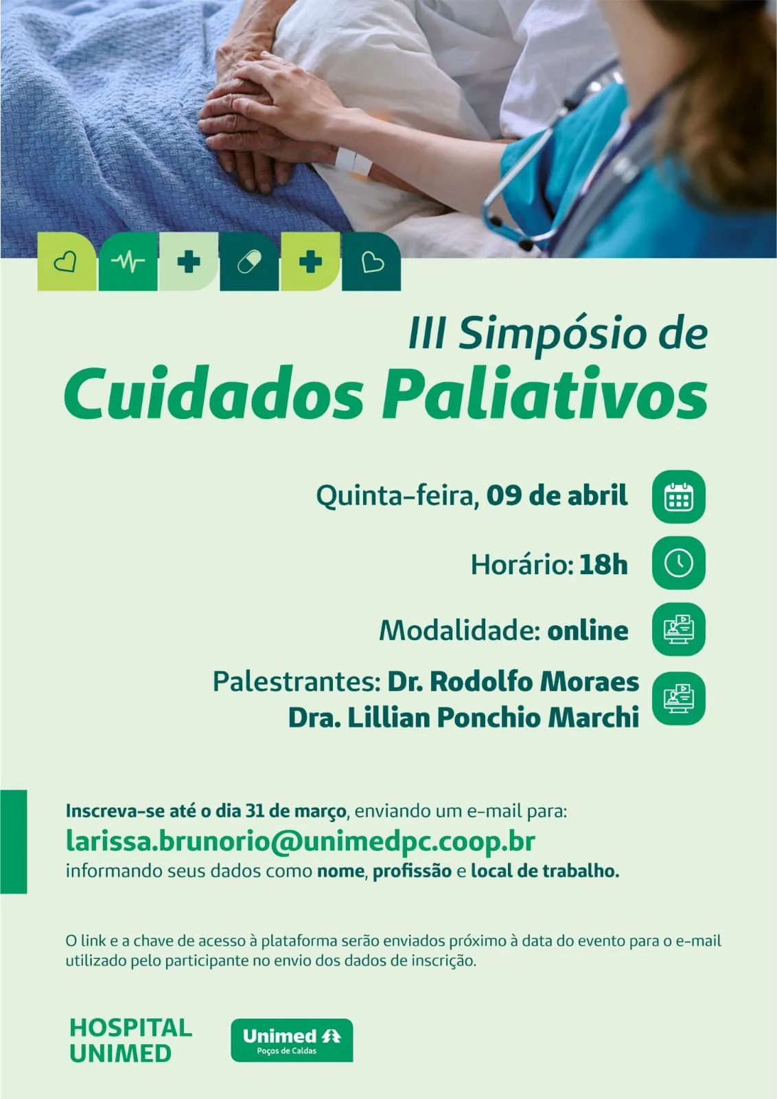 A Unimed Poços de Caldas promove, no dia 9 de abril, às 18h, o III Simpósio de Cuidados Paliativos. O evento será realizado de forma online e é voltado a profissionais da saúde interessados em aprofundar conhecimentos sobre práticas assistenciais centradas no paciente, no conforto e na qualidade de vida.